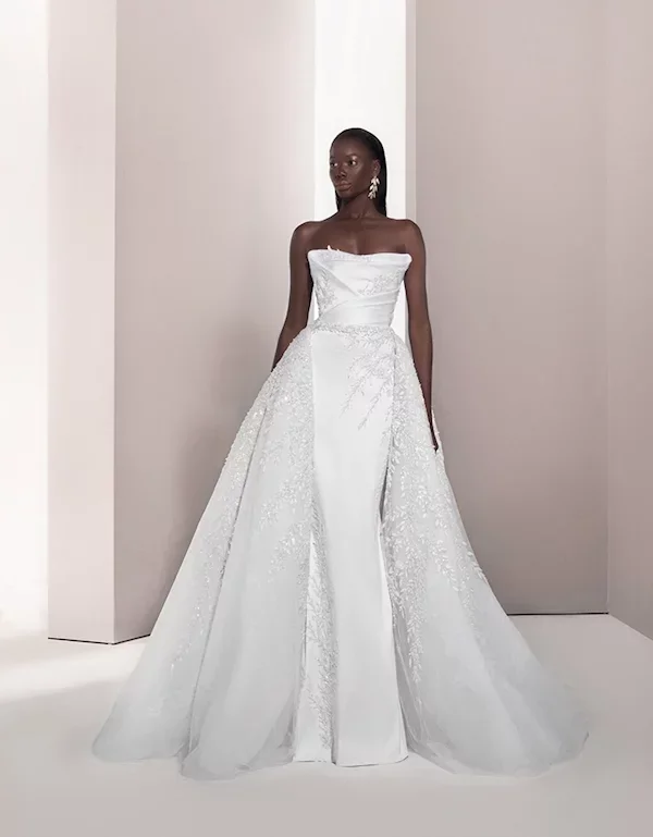 Showcasing impeccable couture craftsmanship, this fitted gown features a strapless cut and cat-eye neckline that elegantly frame the décolletage. Shimmering hand embellishment, organic-inspired appliqués, and draping adorn the structured bodice before meeting a natural waistline and figure-hugging skirt crafted with stretch satin. Instantly elevate this modern bridal look with the gown's detachable tulle overskirt. *Detachable [...]