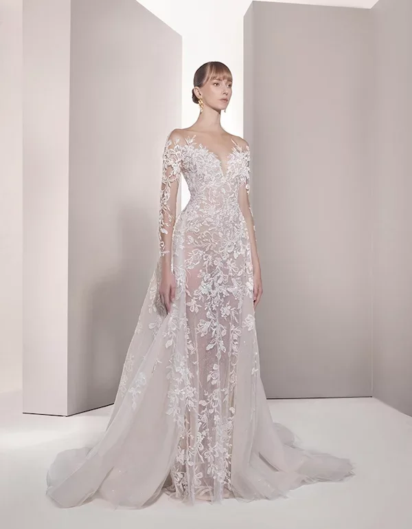 Unique and sexy, this striking fit-and-flare gown features a plunging sweetheart neckline that cascades into off-the-shoulder illusion long sleeves. Expertly crafted with exquisite embellishment and organic-inspired embroidery, the hand-sewn details effortlessly cascade throughout the entirely sheer gown. Instantly elevate this couture bridal look with the gown’s detachable tulle overskirt.