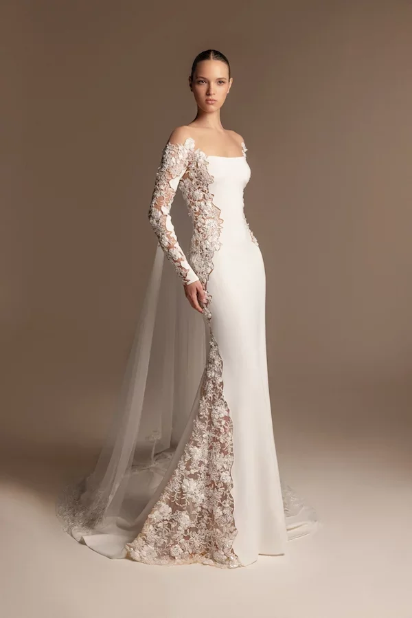 Chic and sophisticated, this couture fit-and-flare gown features an off-the-shoulder neckline that elegantly exposes the décolletage. Sheer sleeves and side cutouts showcase exquisite embellishment and dimensional floral embroidery. Expertly crafted with a luxurious crepe fabric, the sleek bodice and streamline skirt adds a refined touch to this one-of-a-kind bridal look. To finish, a simple circle-cut train completes this unique bridal ensemble.