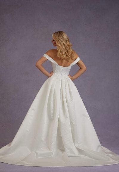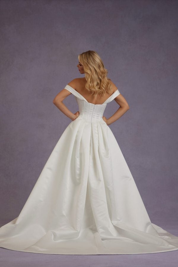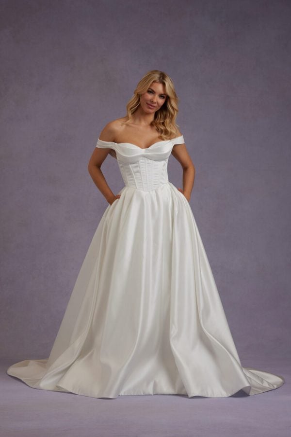 Style #FIA-BLANCHEClassic And Simple Off-The-Shoulder Satin Ball Gown With Pockets