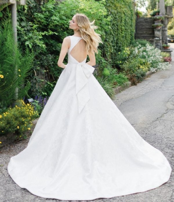 Sleeveless scoop neck, open back gown with bow and cathedral train.