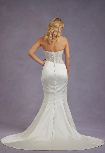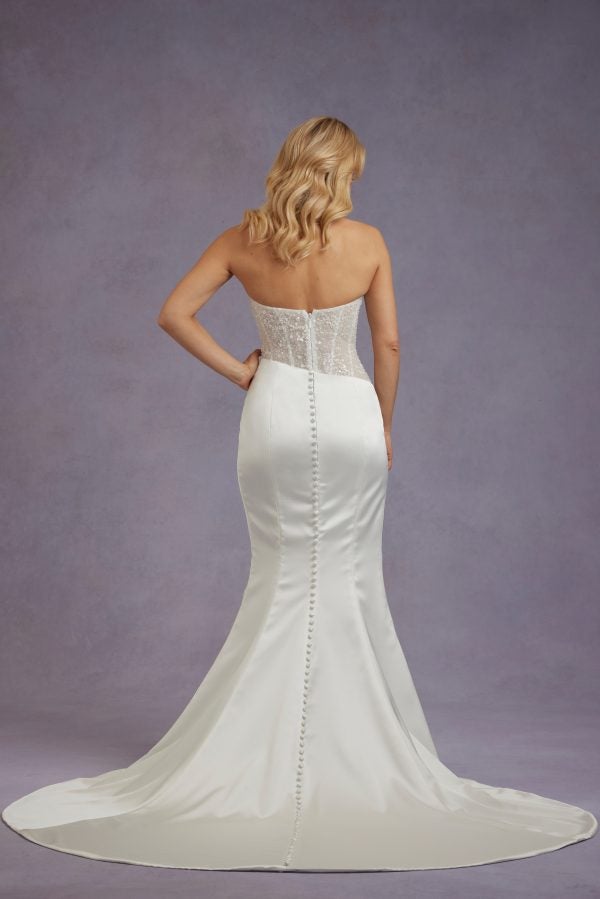 Chic and tastefully sexy, this sheath gown features a strapless cut and classic sweetheart neckline that elegantly frames the décolletage. The sheer corset bodice is meticulously adorned with delicate beading before meeting a dropped, asymmetrical waistline. Expertly crafted with satin fabric, hand-draping and a leg-bearing slit completes the figure-hugging skirt. To finish, a seemingly-endless row of fabric-covered buttons flow into the train.