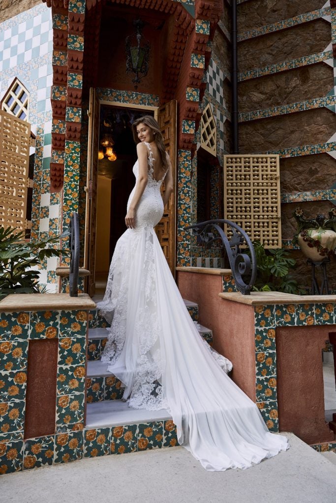 What we love about this style: The perfectly-placed lace appliqués traveling up the arms and down the bodice, dramatic open back, and soft silk crepe skirt.