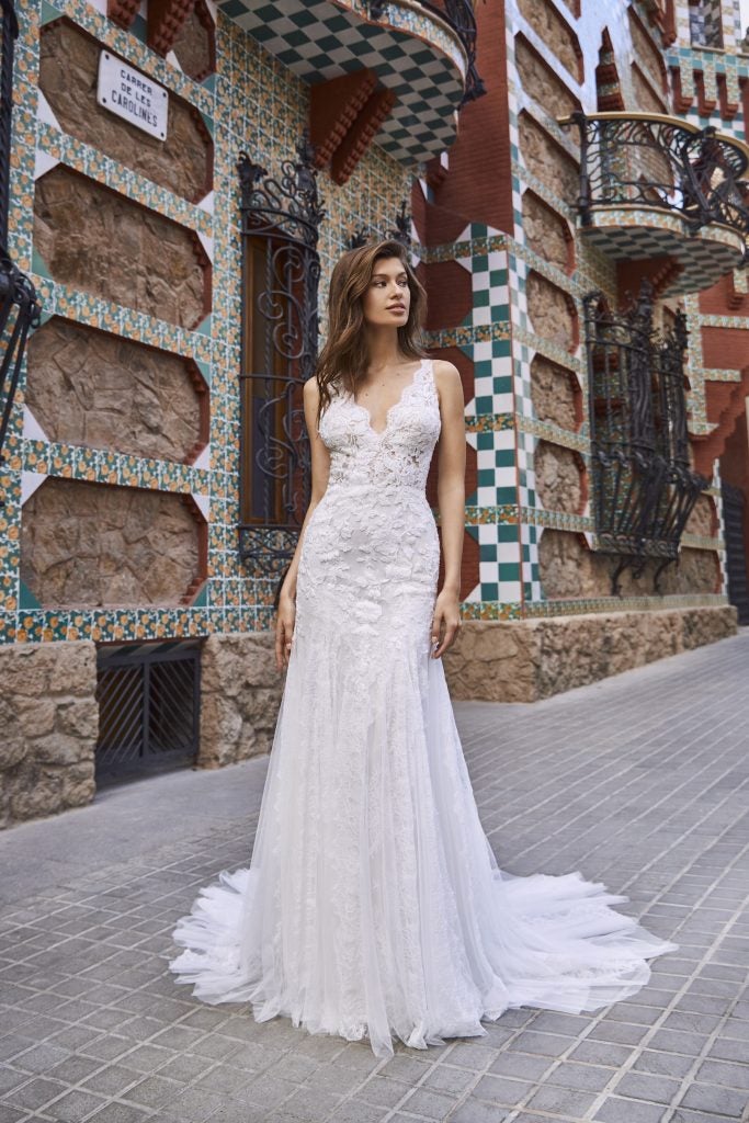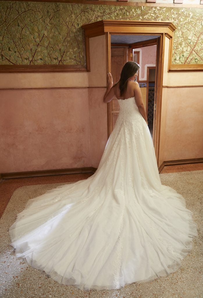 What we love about this style: The romantic and ethereal scalloped deep-v neckline, lace appliquéd illusion back and soft sweep train.
