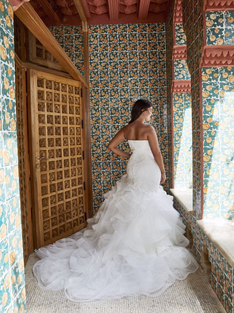 What we love about this style: The fun, flirty and flamenco dancer-esqué horsehair-trim ruffle skirt, flattering mermaid silhouette, and covered buttons down the back.