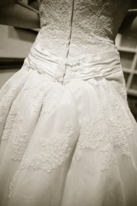 A bustle pulls the train of the wedding dress off the ground so it doesn’t get dirty, allows movement with ease, and alleviates some of the fear of tripping or tearing the train of the gown. Most wedding dresses do not come with a bustle, nor are they designed with a bustle in mind. Talk to your fitter about the best bustle options for you and your reception.