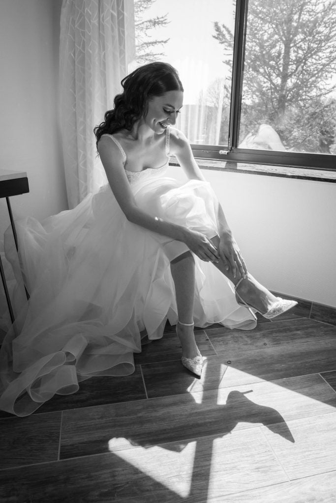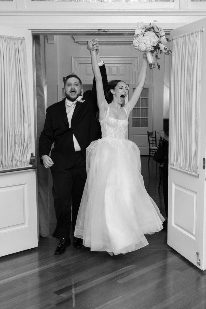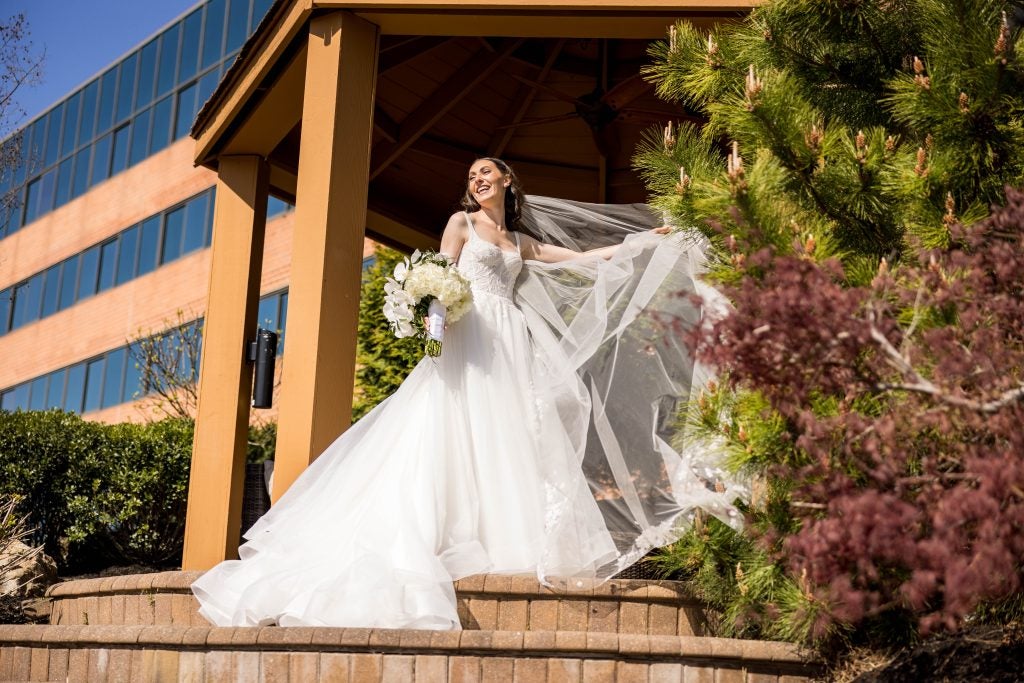 When it came to Ally’s wedding dress, she began the online search looking for simple, modern, and elegant designs as she wanted that ‘Audrey Hepburn’ feel. She found a beautiful dress on the Kleinfeld website called the “Ashford” dress by the designer Michelle Roth. “It had this unique square neckline I’ve never seen on a dress before, a corset bodice I always imagined myself in, and the simplicity and classic style I always wanted. It definitely gave me those ‘Audrey Hepburn’ vibes! Krissy, who was my consultant from Kleinfeld, knew ahead of time this was a dress I wanted to try on and she had it ready and waiting for me when I got to my appointment. The minute I had it on, my expectations were exceeded by a million and I said “YES!” immediately!”