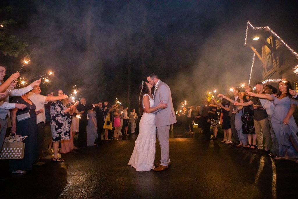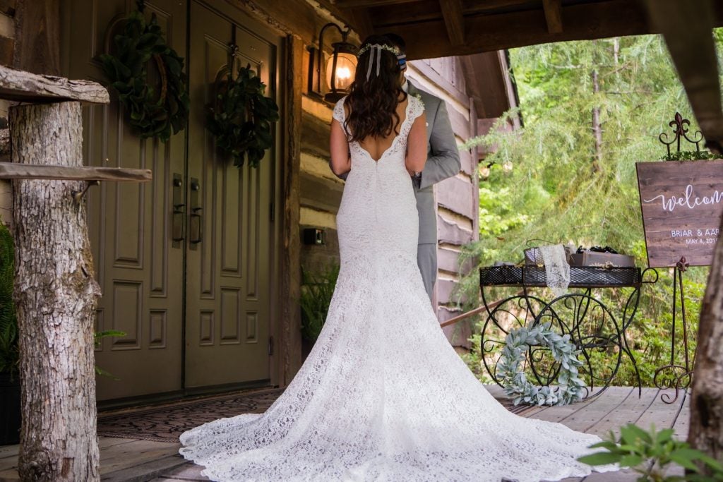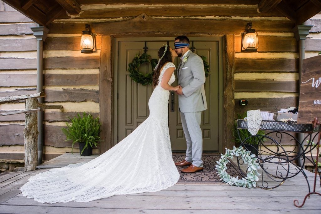 We got married at Indigo Falls in Dallas, GA on May 4, 2019. Our colors were dusty blue and dusty rose with rustic elegant decor! We chose not to see one another prior to the wedding but rather do a first touch and pray together. To ensure Aaron didn’t see me in my dress before the ceremony, he had an American flag bandana custom made with the thin blue line on it since he is in law enforcement and he is my protector! Finally it was time for me to take my first step to the rest of my life. Our ceremony consisted of a wind chime ceremony remembering our loved ones who could not be with us on our special day, a speech from my father in law and a unity cross ceremony. Once again as luck would have it, shortly after the ceremony, the rain came! As Aaron and I were introduced for the first time as Mr. and Mrs we set up to perform our choreographed first dance to Ed Sheeran’s “Thinking Out Loud” which we had practiced for weeks to perfect and it turned out beautifully! The rest of the evening was full of dancing and enjoying being Mr. and Mrs. Schmitz finally!