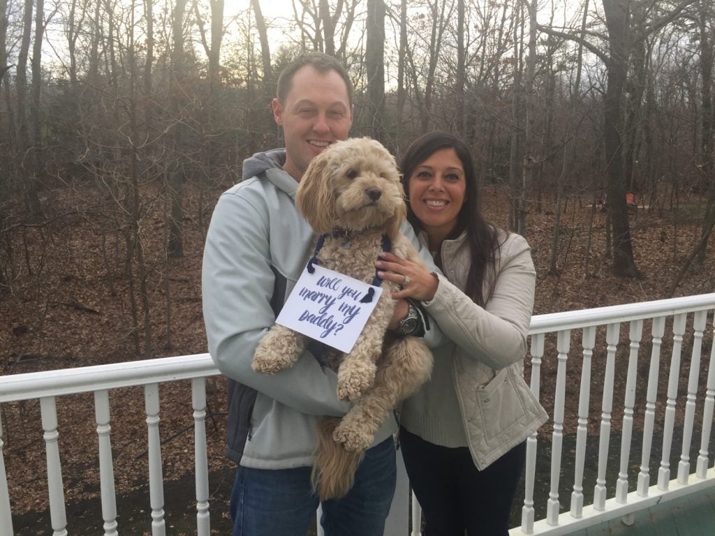 It was 12/24/17 Christmas Eve and bit of a cold day. Ryan asked me to take our usual walk on the beach with our dog Sadie. As we were walking his shoe was untied and told Ryan to tie it. He yelled it’s fine don’t worry about and I said okay. Little did I know he had a sign under his shirt he didn’t want to crush. Ryan kept asking if I loved him and I said yes (in my head I kept wondering why he kept me this asking). I walked ahead of him and when I turned around he was down on one knee with a sign on our dog “will you marry my daddy”. I cried and yelled are you kidding me! It was the most amazing day.