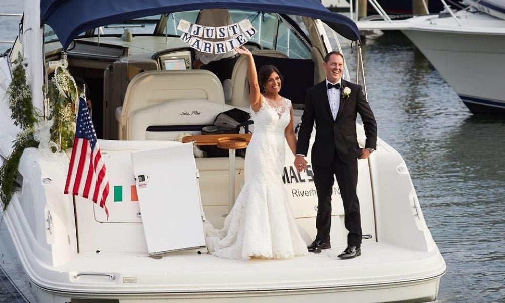 Ryan and I are big boaters and we wanted a wedding that represented us. We were married in Southold, New York at Saint Patrick’s Roman Catholic Church followed by a reception at the Peconic Bay Yacht Club. Since our venue was right on the water we decided to use our boat as our entrance to our wedding reception. It was the most amazing experience!