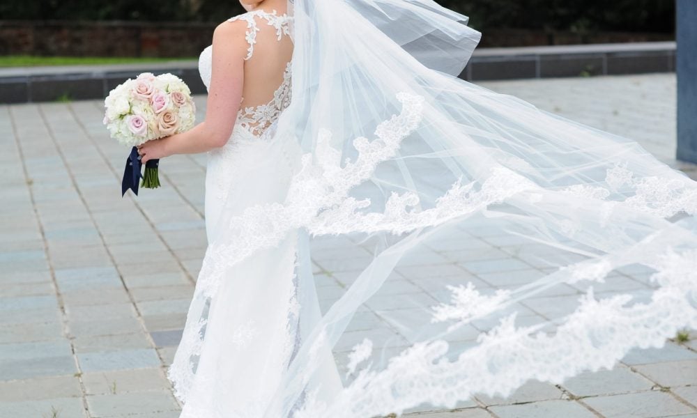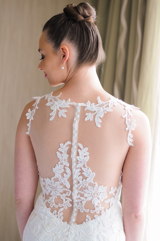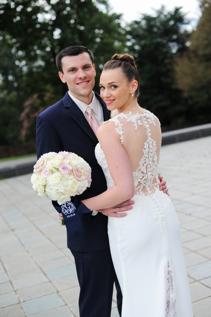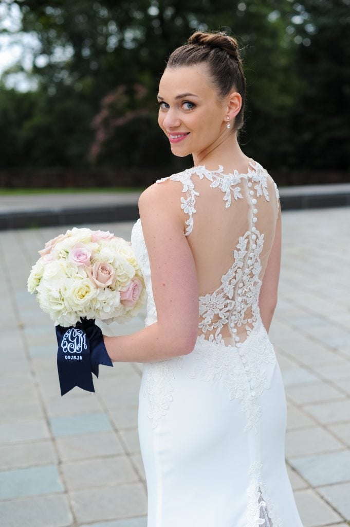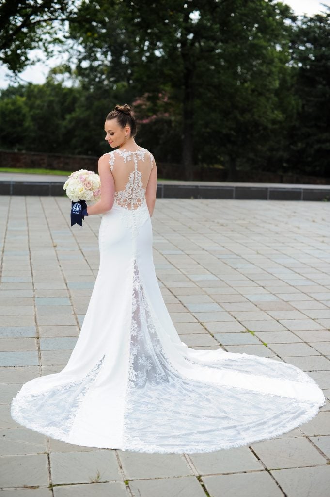 I came with some pictures of what I wanted for my dress. I knew I wanted some lace, a dramatic back, and silk buttons. Dianne knew exactly what I was looking for and pulled some amazing dresses. When we were about to head back to the room, she stopped and said… “Wait! There’s one more you should try on – it’s gorgeous!”. I tried on two dresses that were pretty, but not the one. Then, I tried on was the dress she grabbed last minute and was instantly blown away! When I stepped onto the center platform and turned around to look at my mother, we both broke out in tears! Before I knew it, everyone on the floor at Kleinfeld had their eyes on me and were in awe. I knew that was my dress and said “yes!” My dress and veil are from Maison Signore’s collection. Absolutely gorgeous! Dianne has a great eye!