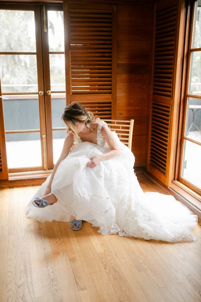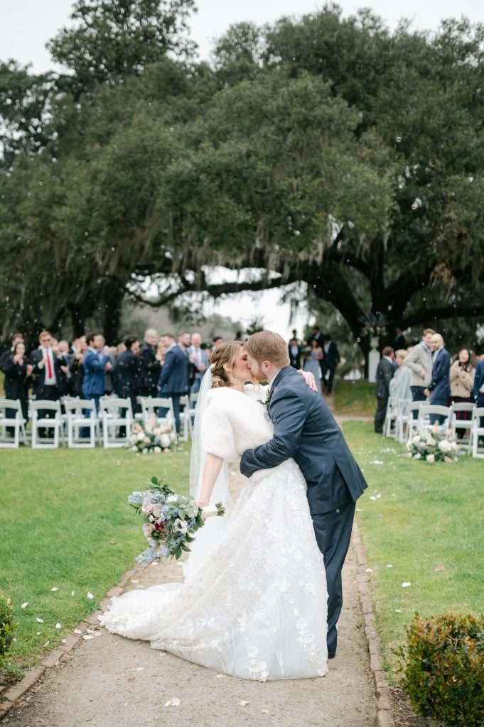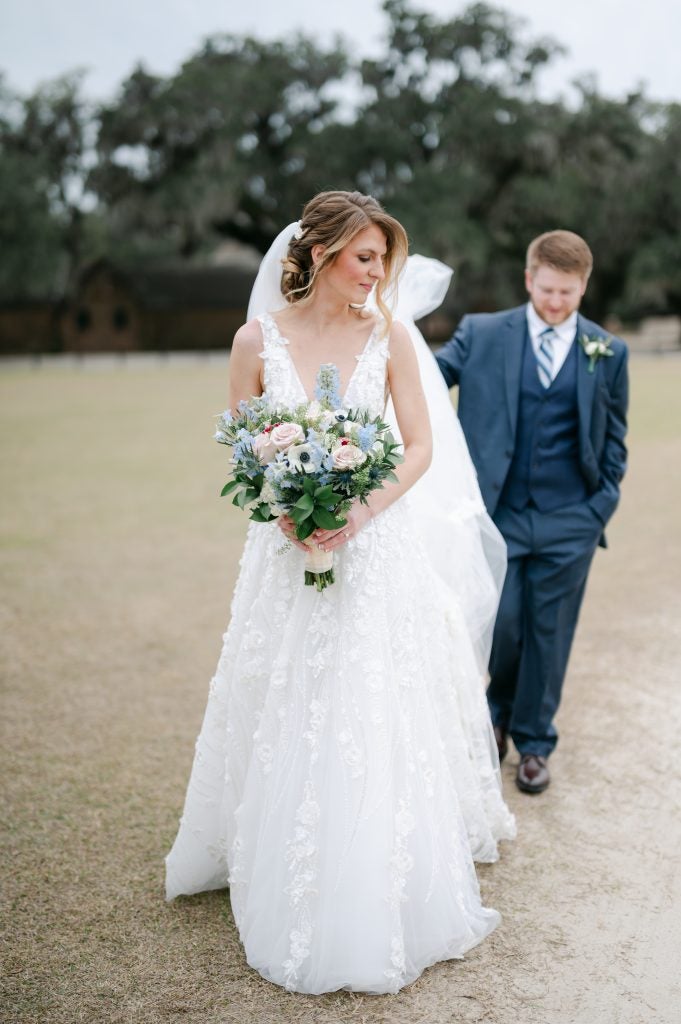 A little over two years after I said “yes!” to the dress, our wedding day finally arrived! We held our wedding in Charleston, South Carolina at the Venue Middleton Place. It’s a gorgeous country estate, dating back to the pre-revolutionary war period, boasting the oldest formal gardens in the United States. We held our ceremony in what the venue refers to as the Octagonal Garden which is a Versailles-inspired garden that was designed by the same landscaper/architect who completed Versailles. Charleston has always held a special place in our hearts since our very first visit four years ago, and with so many friends and family living in the area, we felt it was the perfect location to have our wedding. We said our vows underneath a massive oak tree covered in Spanish moss, overlooking the Ashley River, while our guests sat in the front rows of the garden. Our wedding colors were dusty blue, blush, and white. Floral arrangements hung from the garden’s birdbath, along the ends of the aisle, as well as at the alter. Lucas teared up when he saw me in my dress during our first look. Lucas donned his father’s suit (our unintentional “something borrowed” which is a story for another time) and all of the groomsmen wore blue thistle boutonnieres. From the linens and the bridesmaid dresses to my shoes, the color dusty blue was a focal point throughout the wedding. We held our reception in the venue’s indoor space, called the Pavillion, which has beautiful floor to ceiling windows that showcases the vast property. We brought the outdoors inside by hanging greenery from the ceiling. We had a choreographed first dance to Ed Sheeran’s “How Would You Feel” that took months of learning as we have never danced before. While the day was unseasonably cold for the coastal southeastern city, the vibe of the day felt warm, welcoming, and inviting. My husband and I keep reliving this day in our heads and will never forget how special and beautiful it all was.