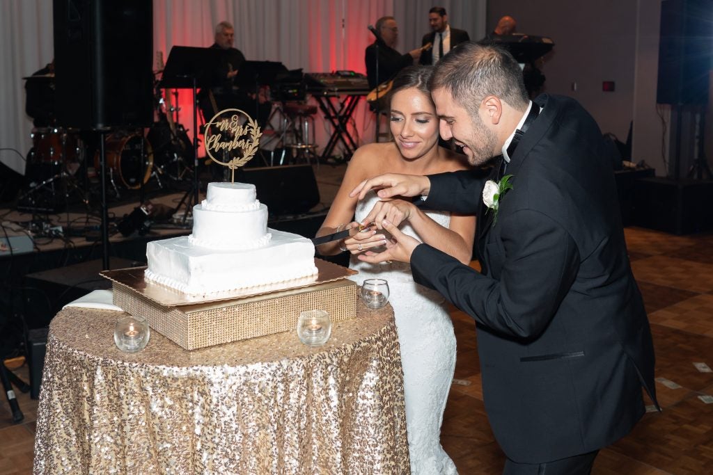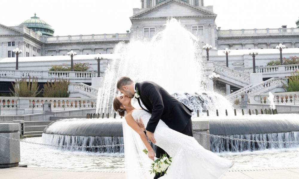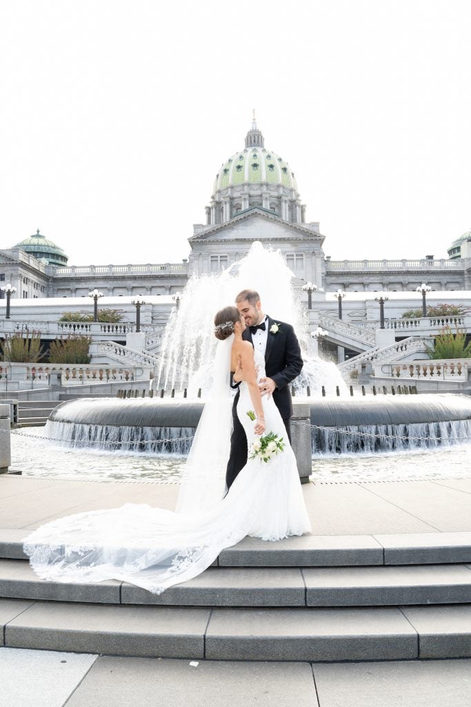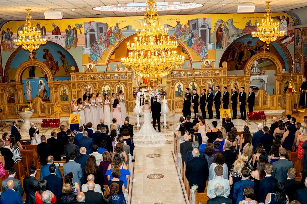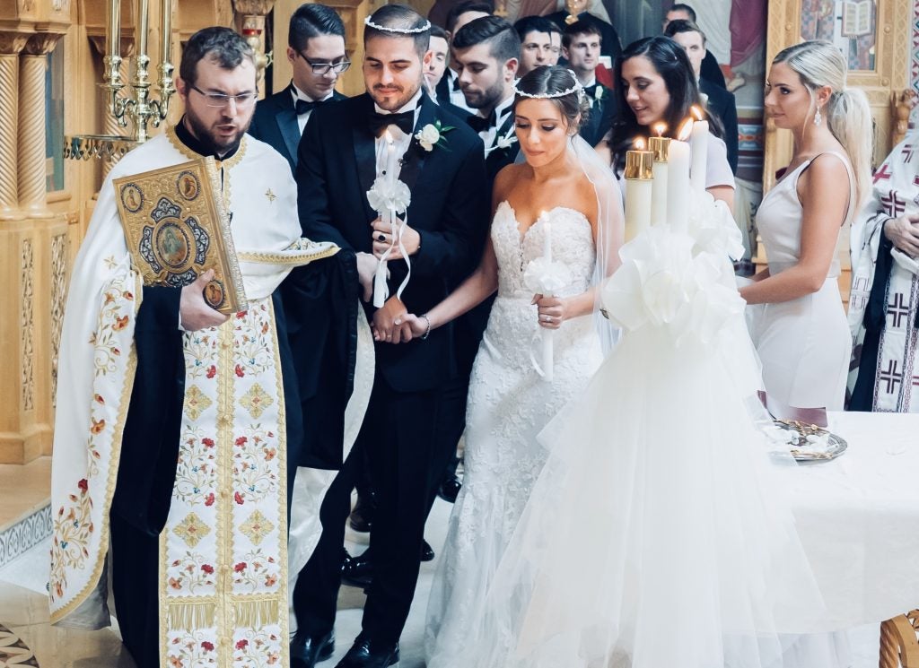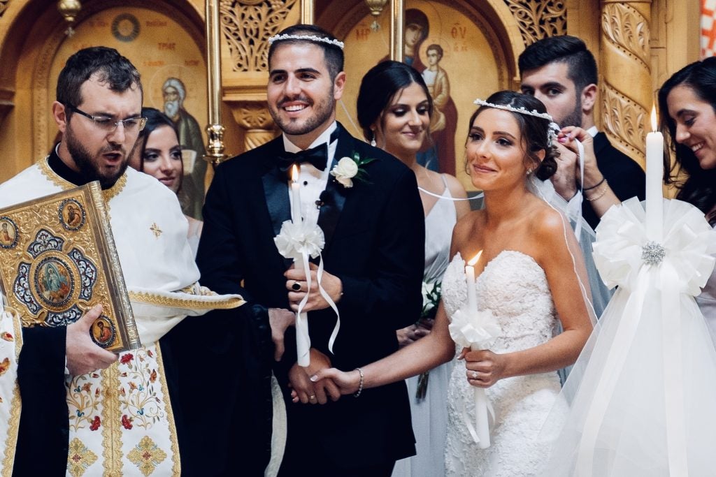 We come from two very loud and large Greek families, so we always knew we were going to have a big, fat, Greek wedding!!! We got married in my church Holy Trinity Camp Hill, PA and had the reception in Harrisburg, PA at the Hilton Hotel downtown. We had over 350 people come to our wedding and it was a night I will never forget. We had a very traditional Greek wedding with lots of Greek dancing, a long ceremony and lots of food! We had our beautiful Byzantine chanter come from DC, we had indoor sparklers that rocked our entrance and a perfect Greek band that kept us dancing all night long. I tried to incorporate our Greek theme with gold leaves and gold olive branches in almost everything. Our favors were Glass evil eye pendants. We had 8 speeches at our wedding – all were incredible and when my twin brother started to sob during his, all 350+ people in the room choked up of course, including me. My husband and I are not big cake fans, so for our cake we got a company to make us an ice cream wedding cake! It was amazing! My husband Ian, before the dancing began, secretly had been planning this all behind my back – got up and sang one of our favorite songs in front of all our guests. Our friend from London, played the piano while Ian sang and I could not believe he pulled off the most incredible surprise! There were so many special moments and it truly was the greatest day of my life! Photos: Frank King