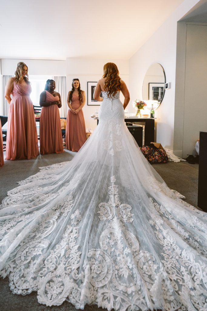 I told Lisa that I wanted an ivory lace dress with a long, dramatic train and cloth buttons. We brought out the Martina Liana 1074 and I knew it was the dress of my dreams. It had everything that I wanted – it was a mix of classy, traditional and boho. The original style of the dress doesn’t have cloth buttons but we were able to customize it so we could change the buttons and extend the train. The train was so long on my wedding day that at least two of my bridesmaids had to help me carry it!! Lisa was my consultant and absolutely amazing – we had so much fun together trying on the dresses.