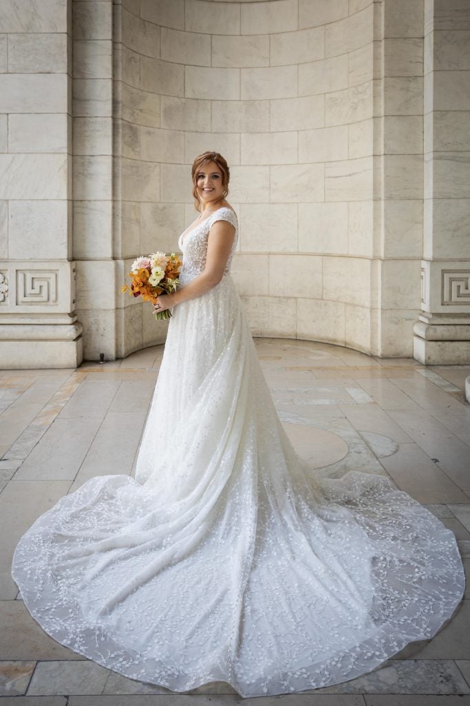 Finally, as my appointment was ending, Dorothy came up to us and let us know that she had found it on the new arrivals rack. It was a brand new sample and I was the first person to try it on! As soon as I put it on, I knew it was the one. Everyone around me in the showroom on a crowded Saturday also agreed.