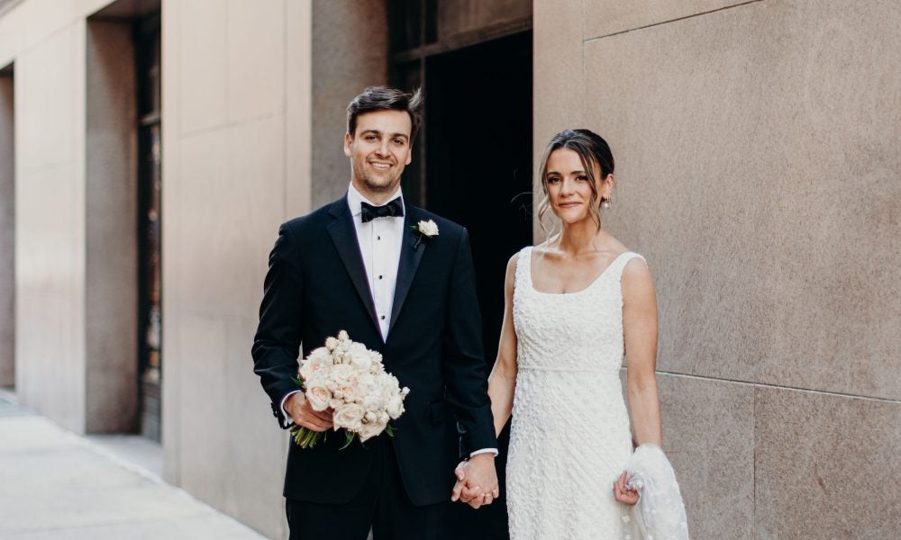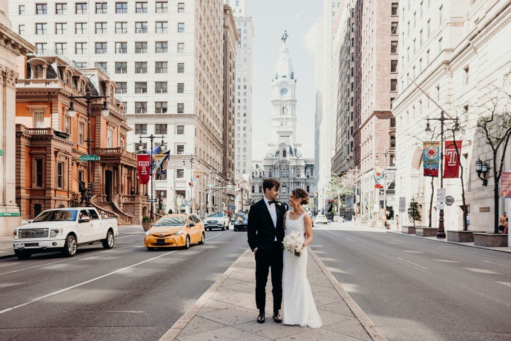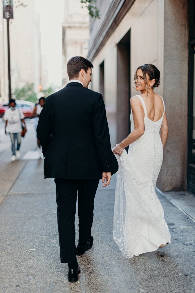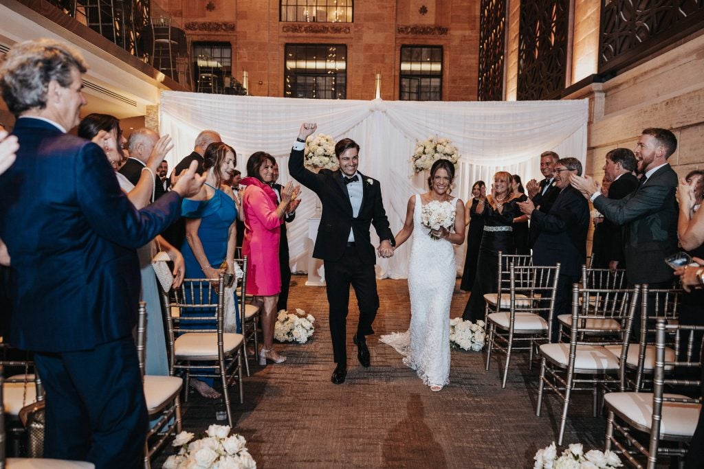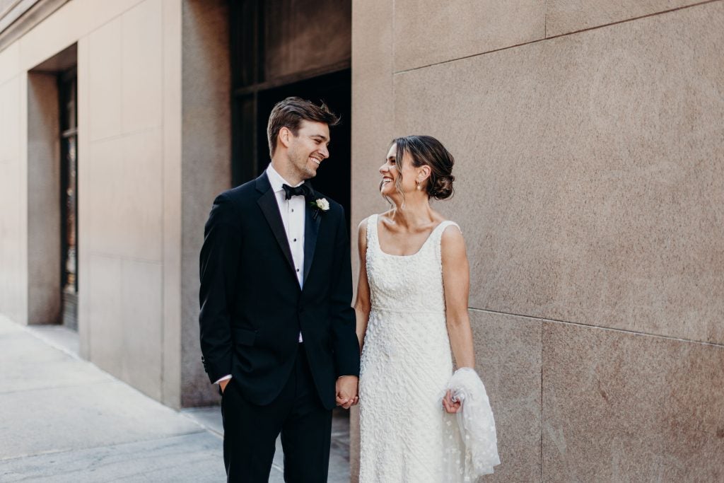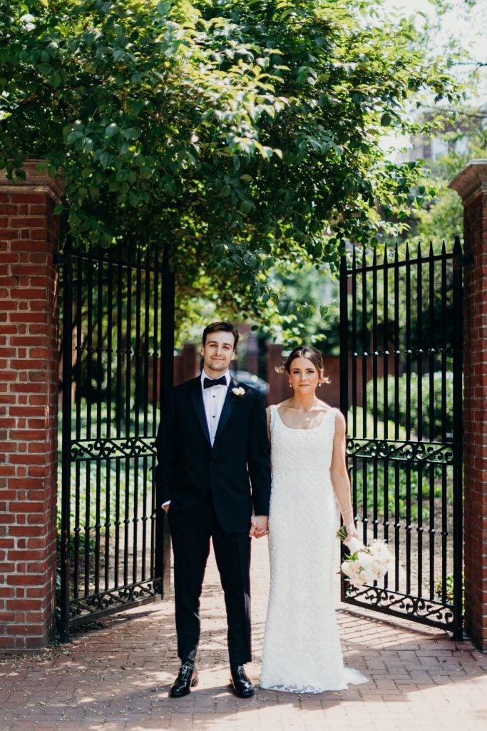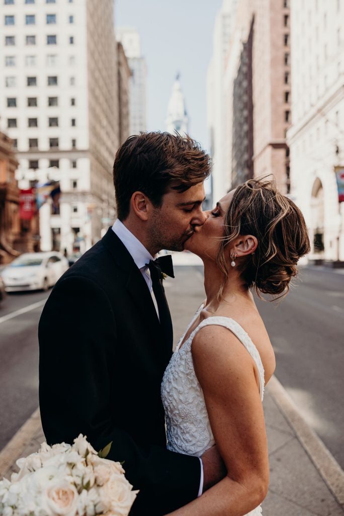 Kerry and Connor got married in Philadelphia, Pennsylvania in a stunning venue that first opened in 1888 as a bank. With tall, stunning ceilings and white stone walls with a grand staircase to match, it was the perfect setting to complement the elegance and uniqueness of the gown. With 130 of their closest friends and family, Kerry and Connor said “I do” on June 8, 2024, celebrating through the night, singing and dancing along with an incredible band, and devouring delicious meals followed by a vintage-style cake and a viennese dessert station.