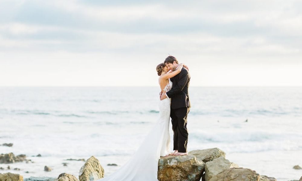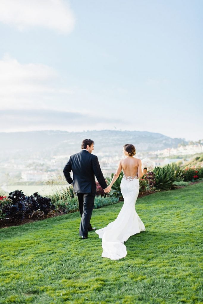 We exchanged our vows beneath a structure from Found Rentals that was adorned with lush, beautiful florals and draping by Fayaz Bloom Box Designs. River and Bridge created gorgeous custom gold fan programs for the ceremony that were such a beautiful added touch. Following the ceremony overlooking the Pacific Ocean, guests enjoyed the stunning view while relaxing on lush lounge vignettes on the patio during cocktail hour. Following cocktail hour, guests entered the luxurious ballroom for dinner and dancing. The reception was blush, blush, and more blush – even the chair cushions were blush! It was so dreamy! Guests danced the night away to tunes from Elevated Pulse and ended the evening with yummy In N’ Out burgers – such a treat for these Texans who can’t have one whenever they want!
