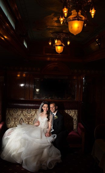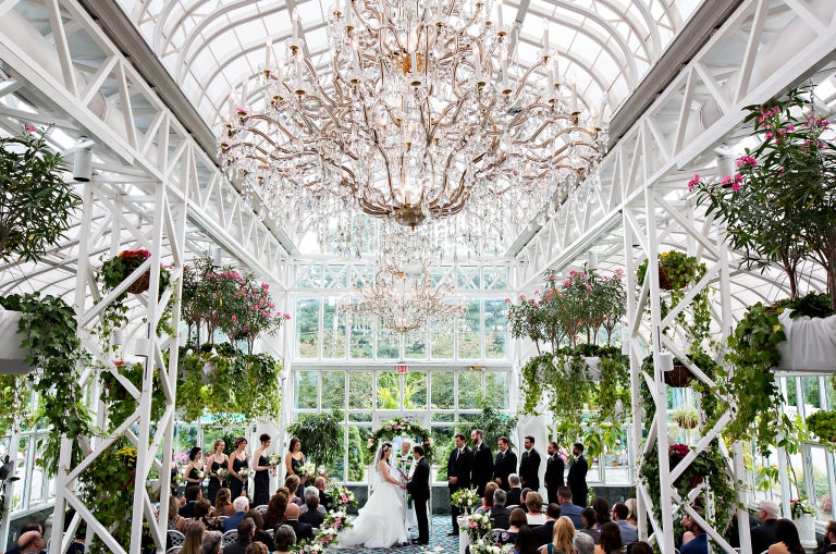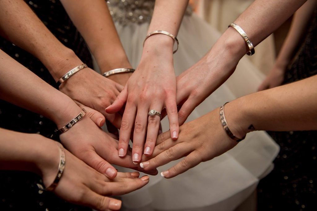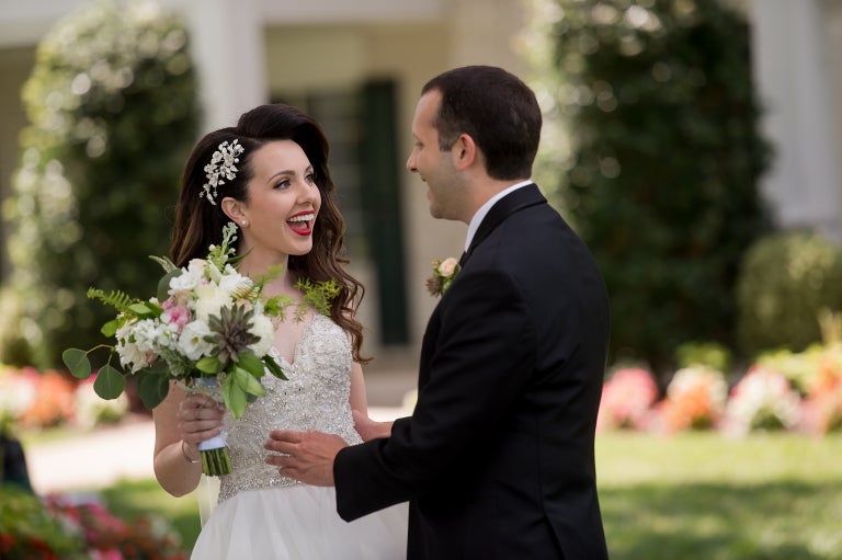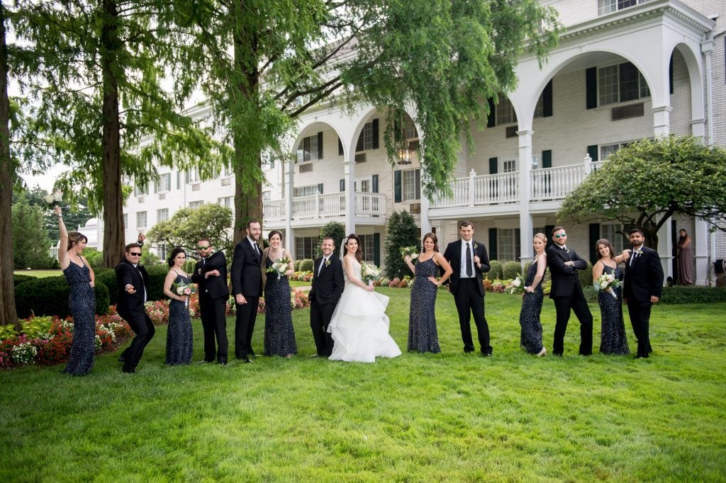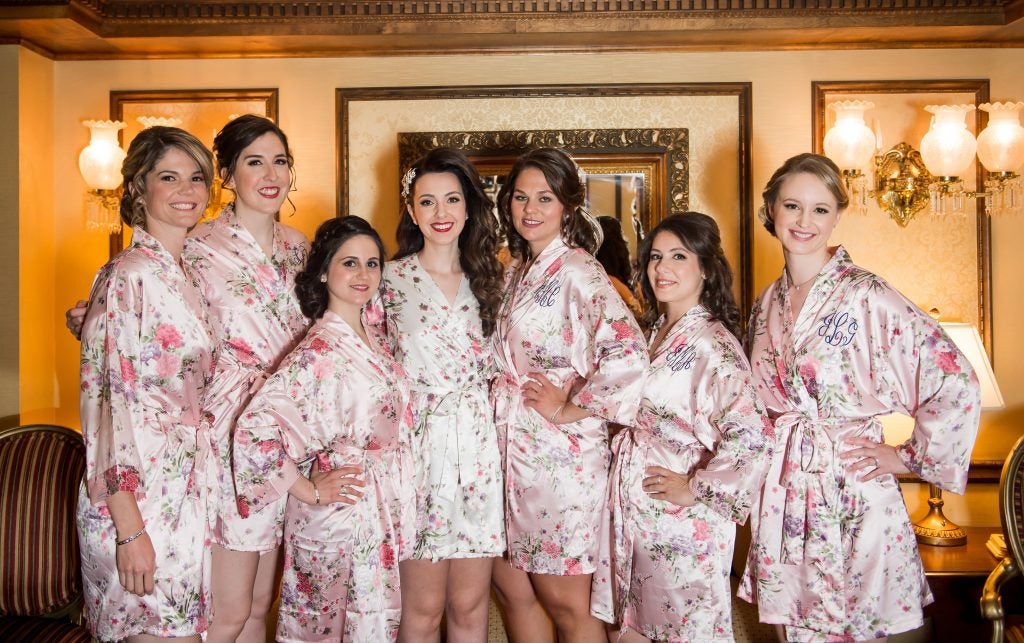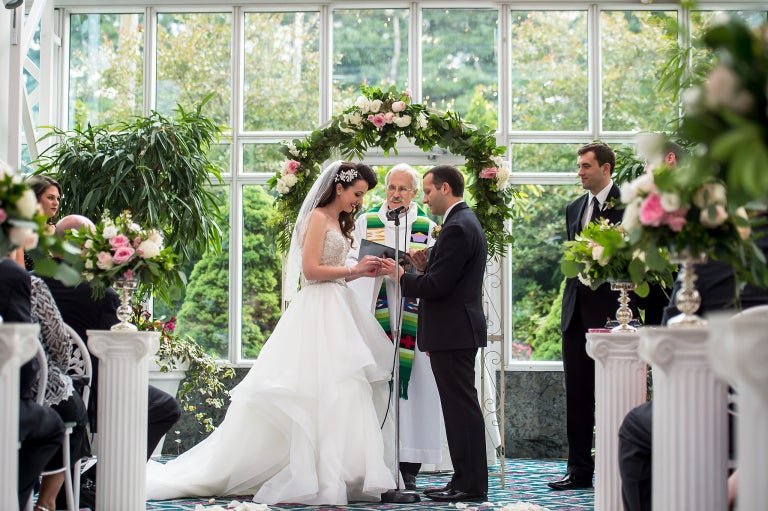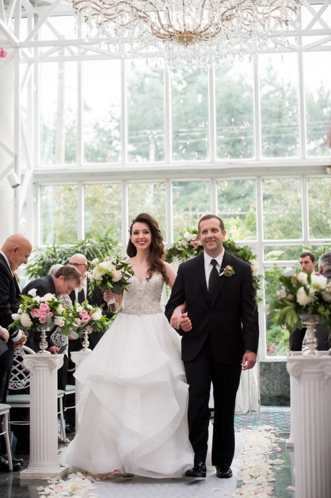 For flowers, we used succulents, garden roses, and greenery to reflect the gorgeous qualities of the conservatory where our ceremony was, as well as have a unique twist on flowers. I had a heart shaped piece of fabric from my grandmother’s handkerchief sewn inside of my dress, since my grandmother was ill and could not attend the wedding. I placed a charm of a picture of my grandfather around my bouquet to honor his memory. The bridesmaids wore navy beaded dresses, which was the original inspiration for the navy accent in our wedding colors. I am a science teacher but one of my hobbies is art, and so I hand designed a logo for our wedding which I utilized on our letter-pressed invitations and our favors, which were pint glasses for each guest.