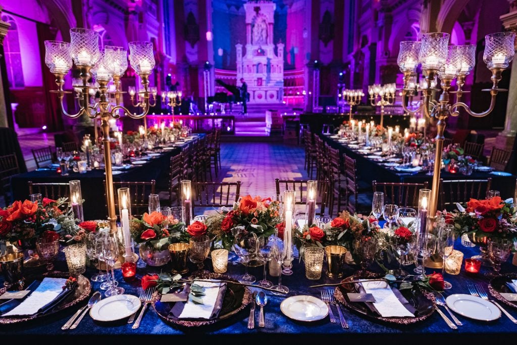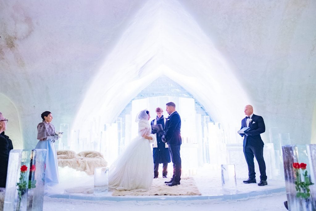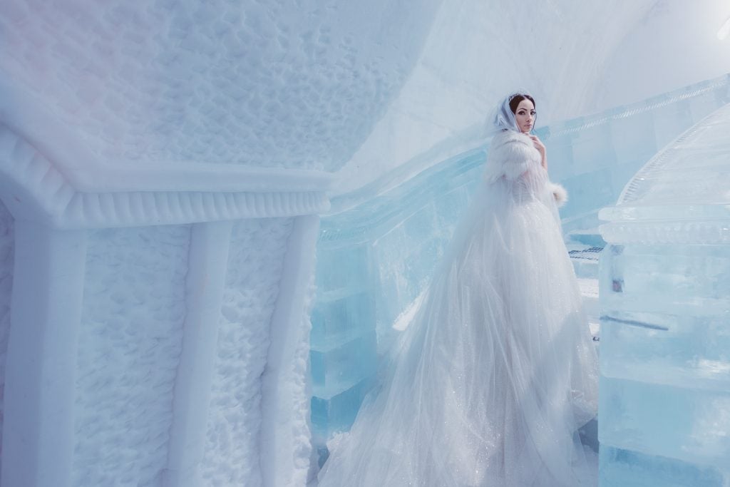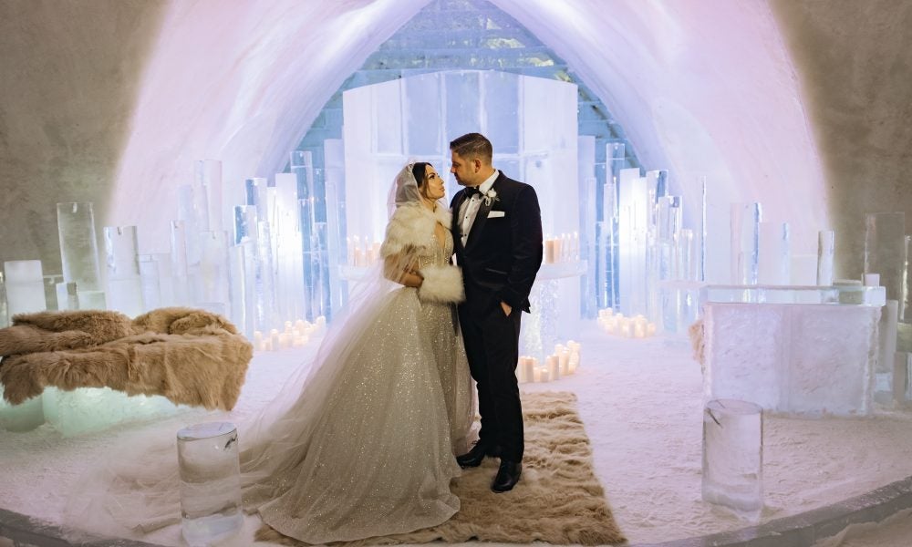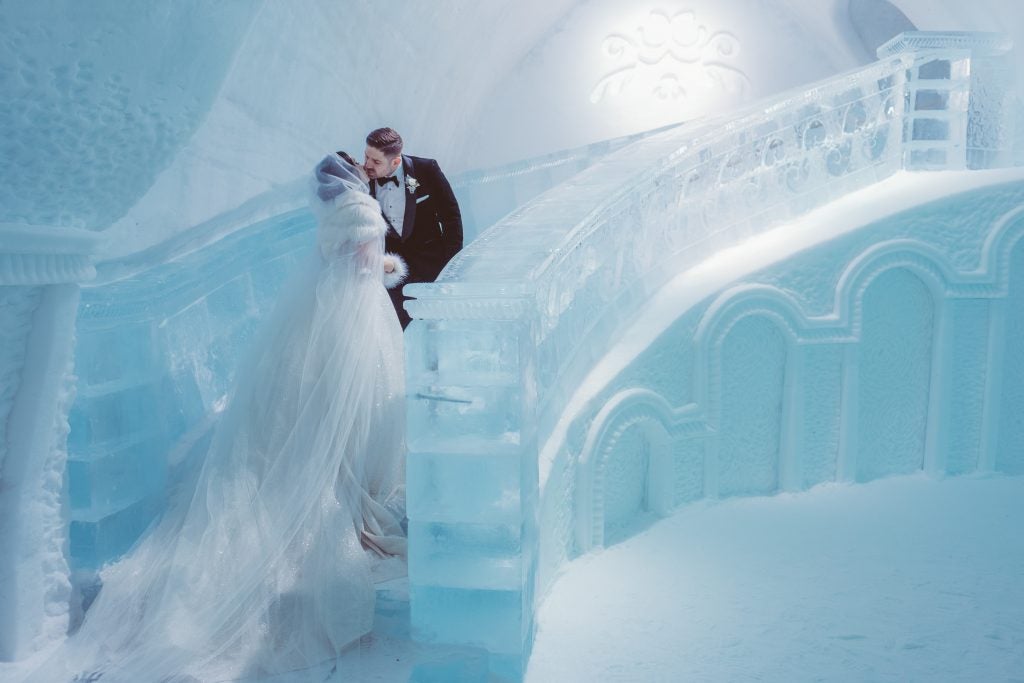 While we are both born and raised in New Jersey, our intimate destination winter wedding took place in Quebec City, Canada, a true winter wonderland. The ceremony was held in a chapel within an igloo made exclusively out of ice and snow at a hotel named the Hotel de Glace, or Ice Hotel. The overall theme of the wedding was “Romeo and Juliet.” The Baz Luhrmann film, “Romeo + Juliet,” was the inspiration, and the soundtrack from the film was played throughout the entire evening. During our evening ceremony, hundreds of candles illuminated the ice chapel and red roses were encased in ice. An electric violinist and live vocalist performed songs, some inspired by Disney and the icy venue itself, like “Let it Go” from Frozen and “Someday My Prince Will Come” from Snow White. As the groom and the rest of the wedding party walked down the aisle, “Like a Prayer” by Madonna was played as they approached the candle-filled altar. The bride walked down the aisle to the same song Juliet walked down the aisle to Romeo in the film that inspired the wedding. A horse drawn sled swept us away after the ceremony, as our guests lined up outside of the igloo, each holding a lantern in the darkness to send us off. Our reception took place in Old Quebec within another chapel, this one a church from the 1900’s that has been deconsecrated. The location was kept a secret to our guests. They entered through a modern basement where the cocktail hour was held, illuminated by neon lights and by the sound of a drummer playing modern rock and love songs. When they arrived at the romantic and dramatically lit reception space they gathered near the altar where our electric violinist and vocalist performed a dazzling rendition of “Ave Maria.” The bride and groom were then announced and danced their first dance on the altar to the song “Yellow” by Coldplay. The theme of a single red rose, signifying our singular and passionate devotion to one another, appeared throughout the evening, including encased within ice at our ceremony, emblazoned on our wedding cake, and laying upon our dinner plates at the reception. The theme of love as our religion, as depicted in the Baz Luhrmann film, was heavily featured on our invitations, which included a sacred heart and angel wings, and of course demonstrable in our choice of reception venue: a former Catholic chapel. The Maid of Honor’s speech was framed as a re-worked version of the prologue to the Shakespearean play, and Romeo and Juliet’s “star-crossed” love was depicted in the names we chose for our signature drinks, like the “Love Potion” and our “Star-Crossed Sangria.” Dinner was served upon blue velvet tablecloths topped with scarlet flowers, gold candelabras, single red roses placed upon our plates, and endless candles, as a cellist and pianist played modern love songs while we feasted. Afterwards, we danced to the sounds of a DJ and electric violinist until 3:00 AM in the romantic and beautifully lit chapel.