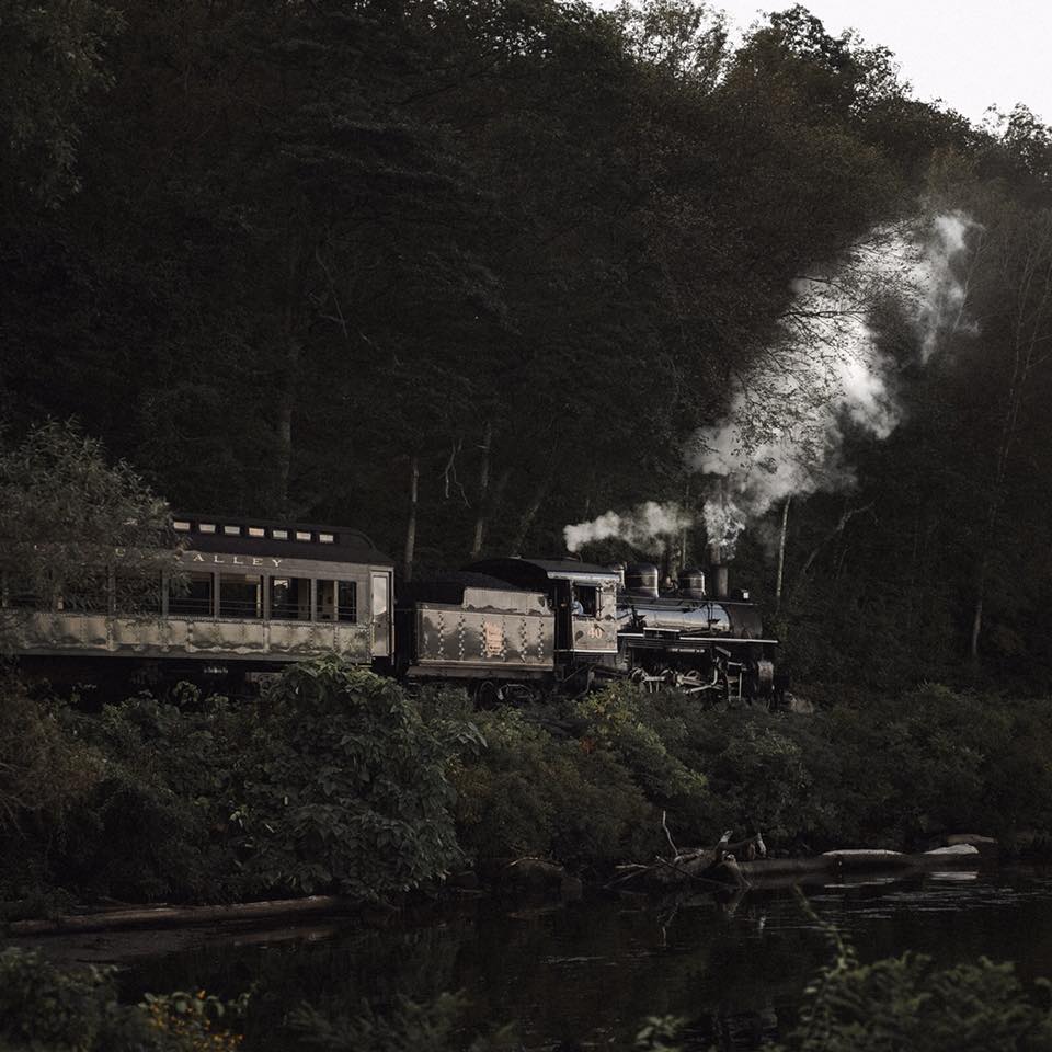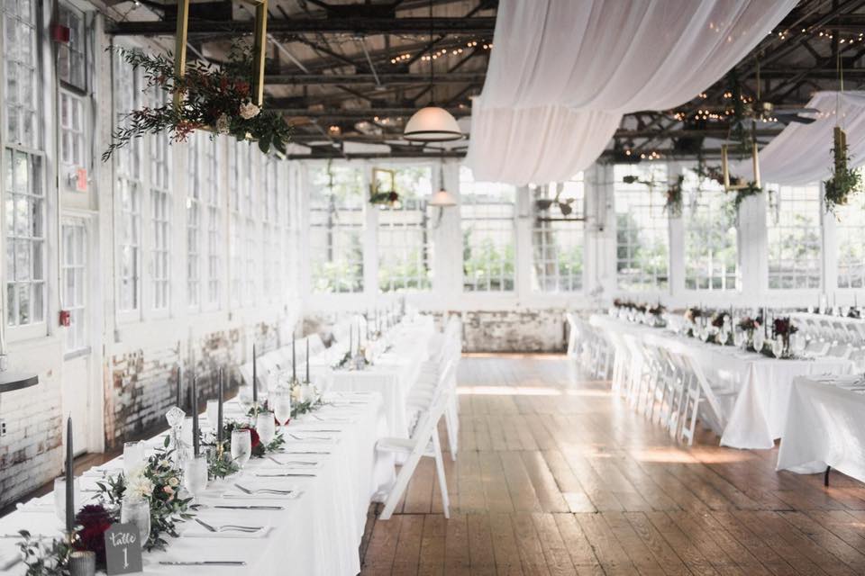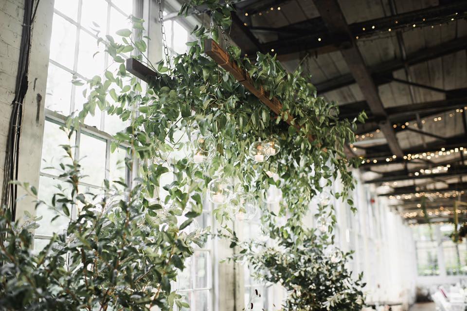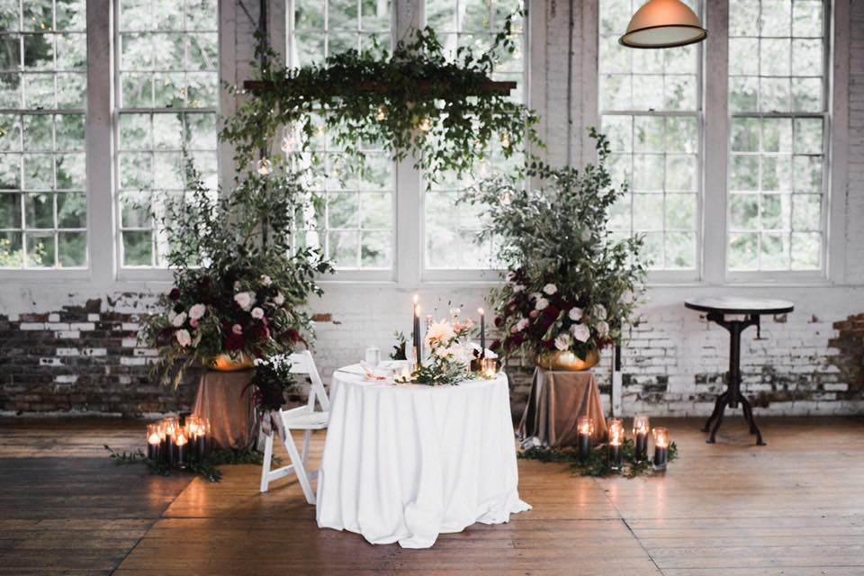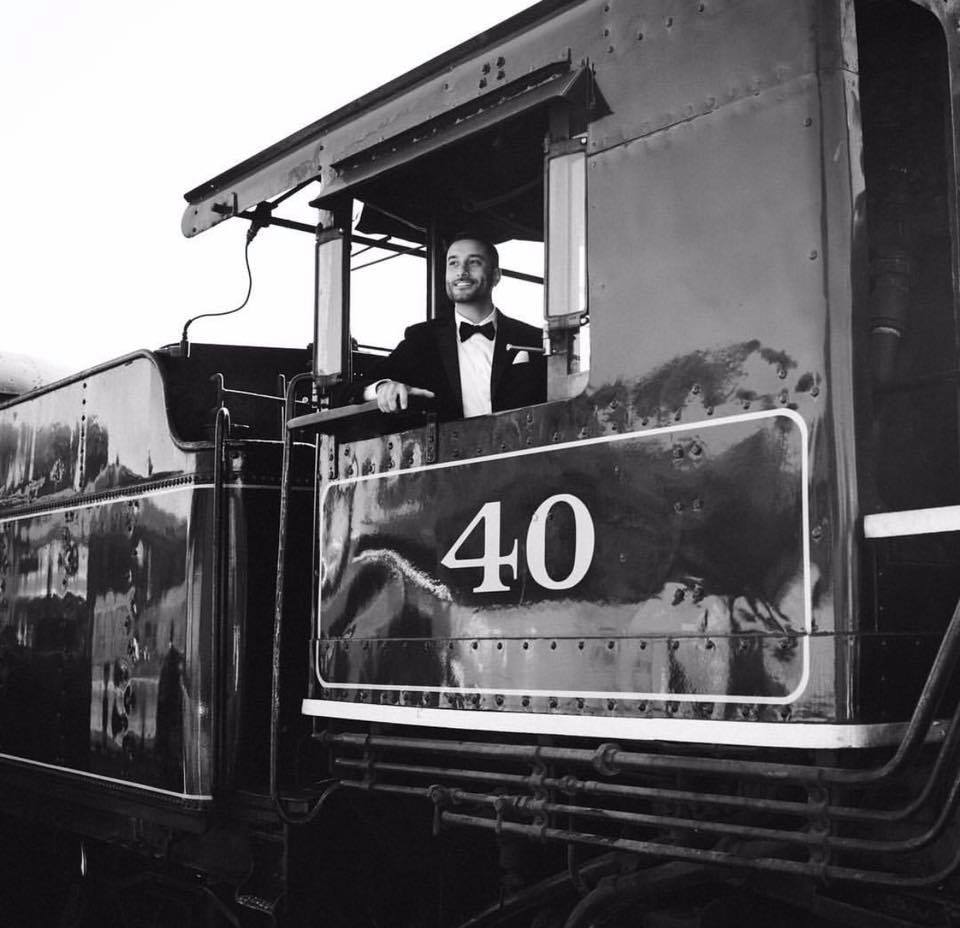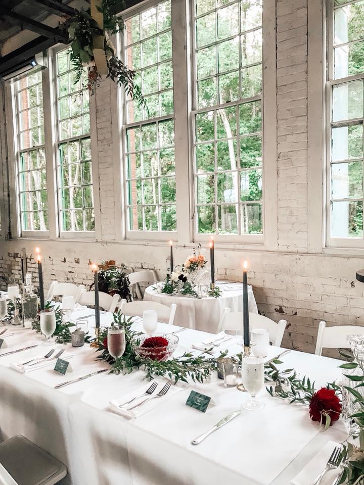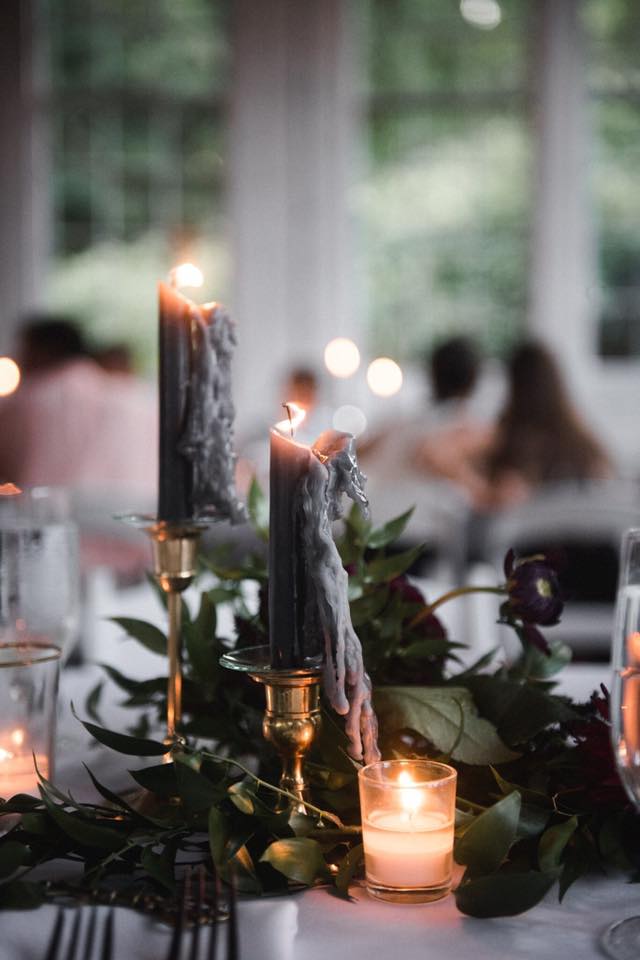 We rented a vintage steam train to take our guests to and from the wedding. Our venue was located in Deep River, Connecticut. A spacious room with white-washed exposed brick in-between the wall to wall windows. Gold frames hung from the ceiling. Moody grey candle sticks nestled in greenery. Vintage crystal decanters scattered across long farm tables.