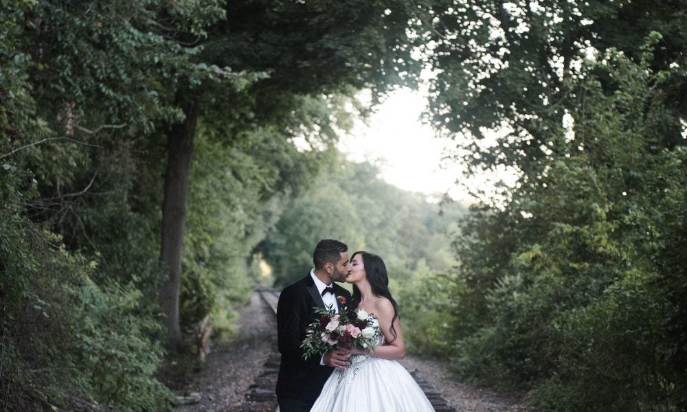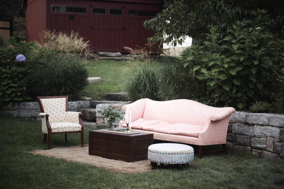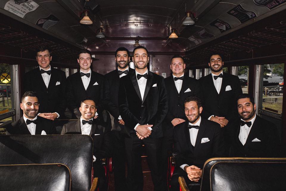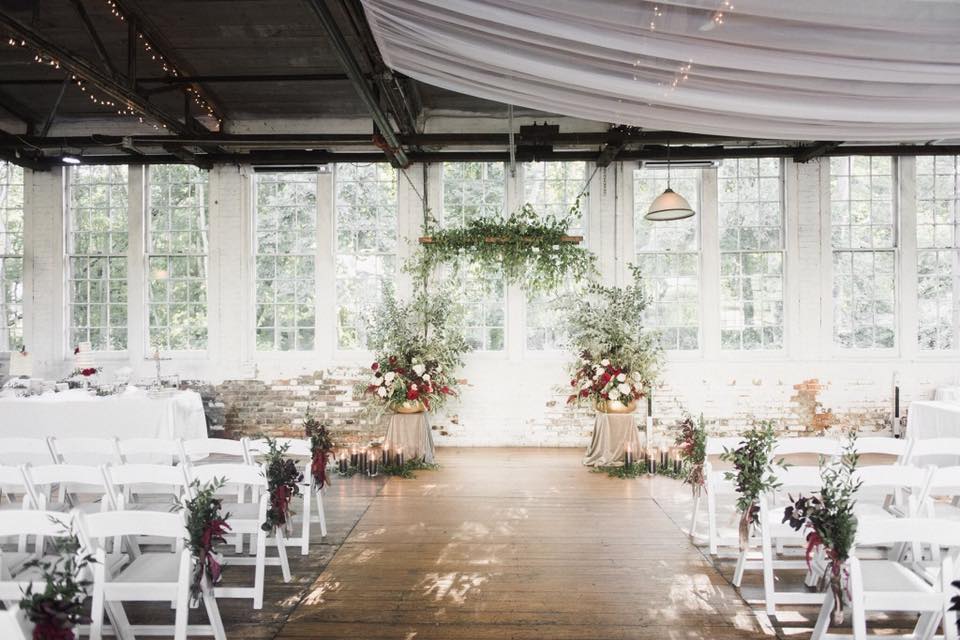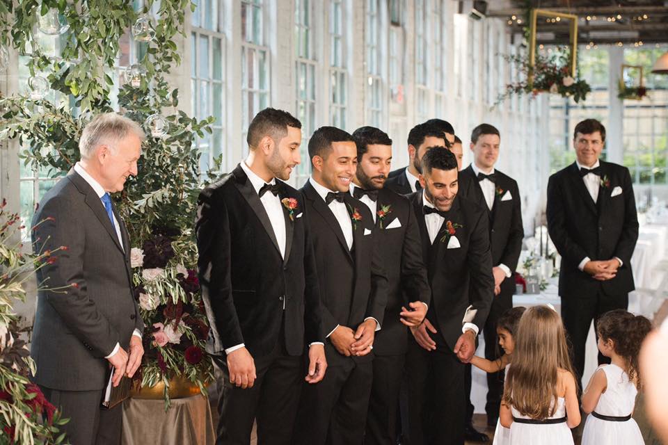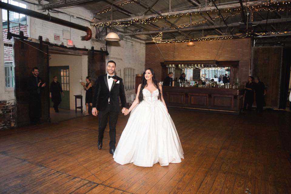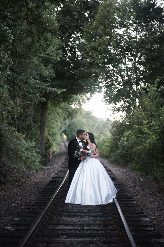 We rented a vintage steam train to take our guests to and from the wedding. Our venue was located in Deep River, Connecticut. A spacious room with white-washed exposed brick in-between the wall to wall windows. Gold frames hung from the ceiling. Moody grey candle sticks nestled in greenery. Vintage crystal decanters scattered across long farm tables.