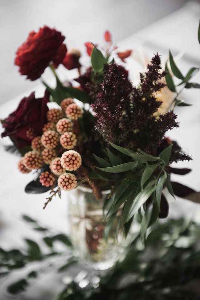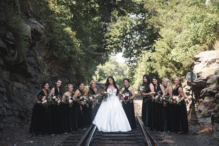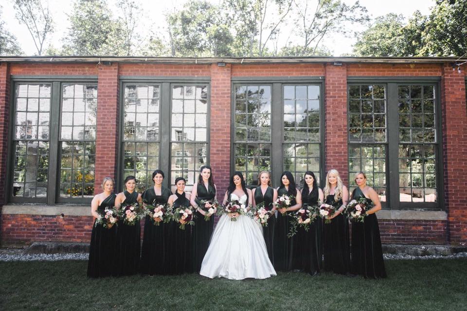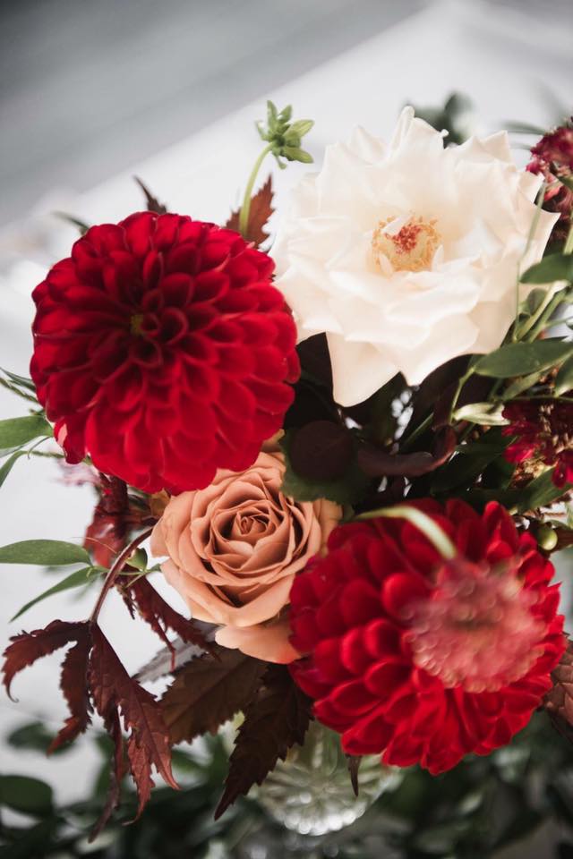 Our wedding had a vintage, romantic theme —featuring rich fall tones. Emerald green velvet bridesmaid dresses. Bouquets filled with parchment roses, deep red dahlias, and enchanting greens.