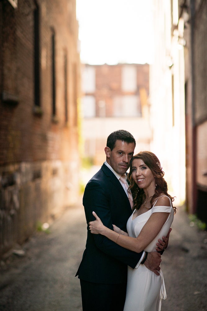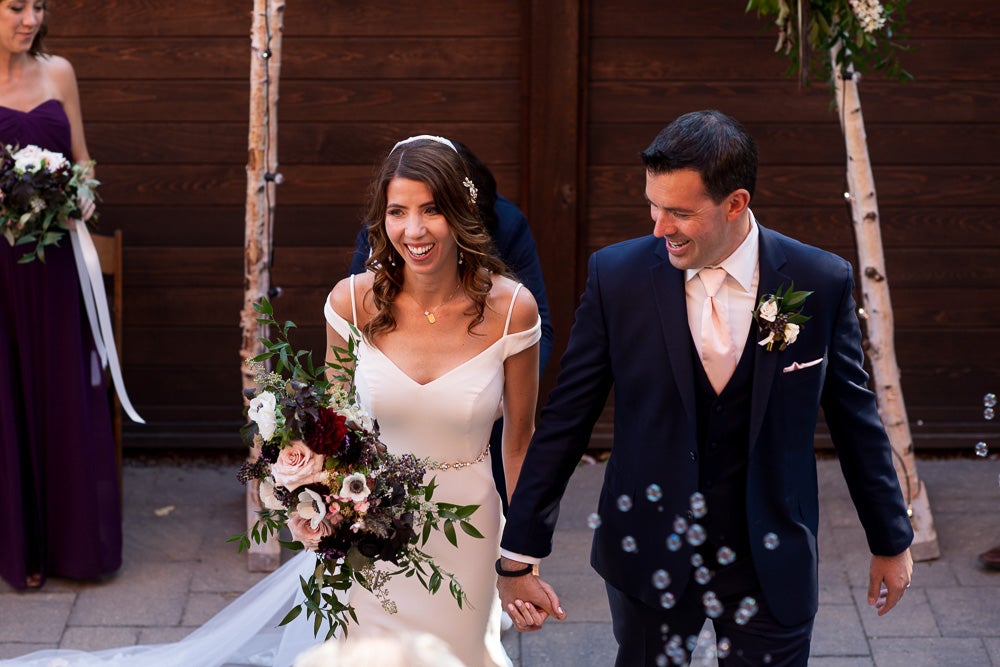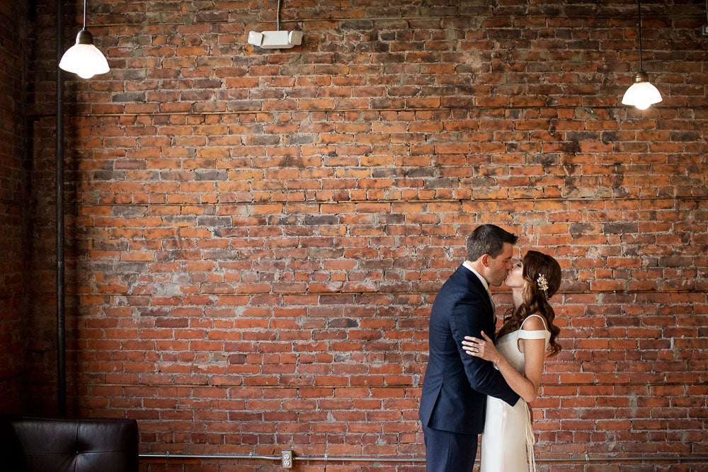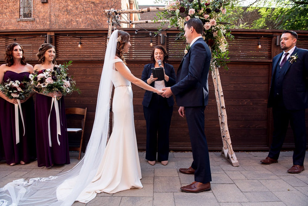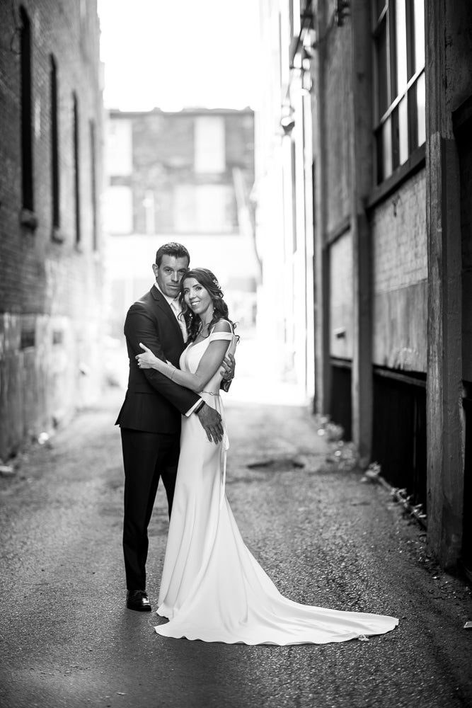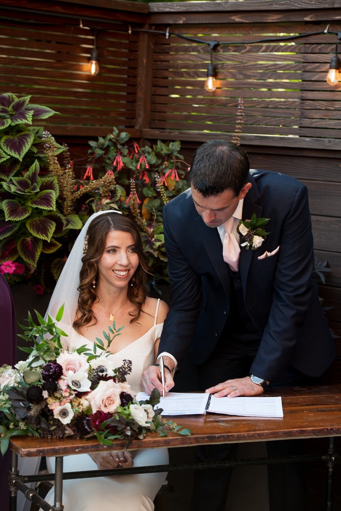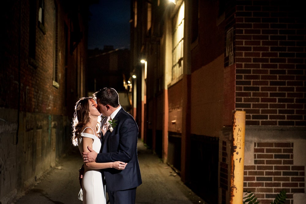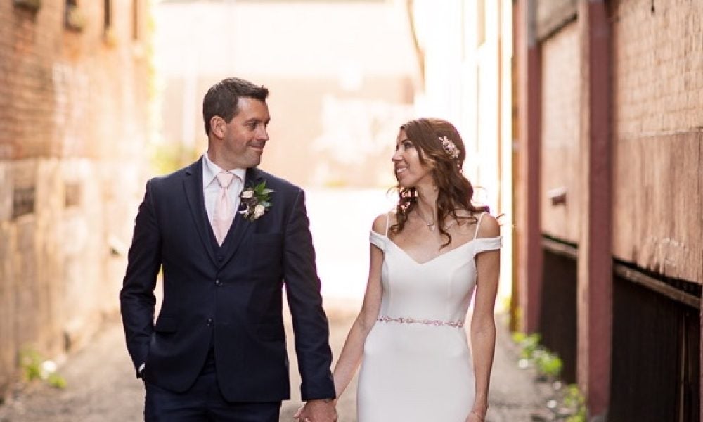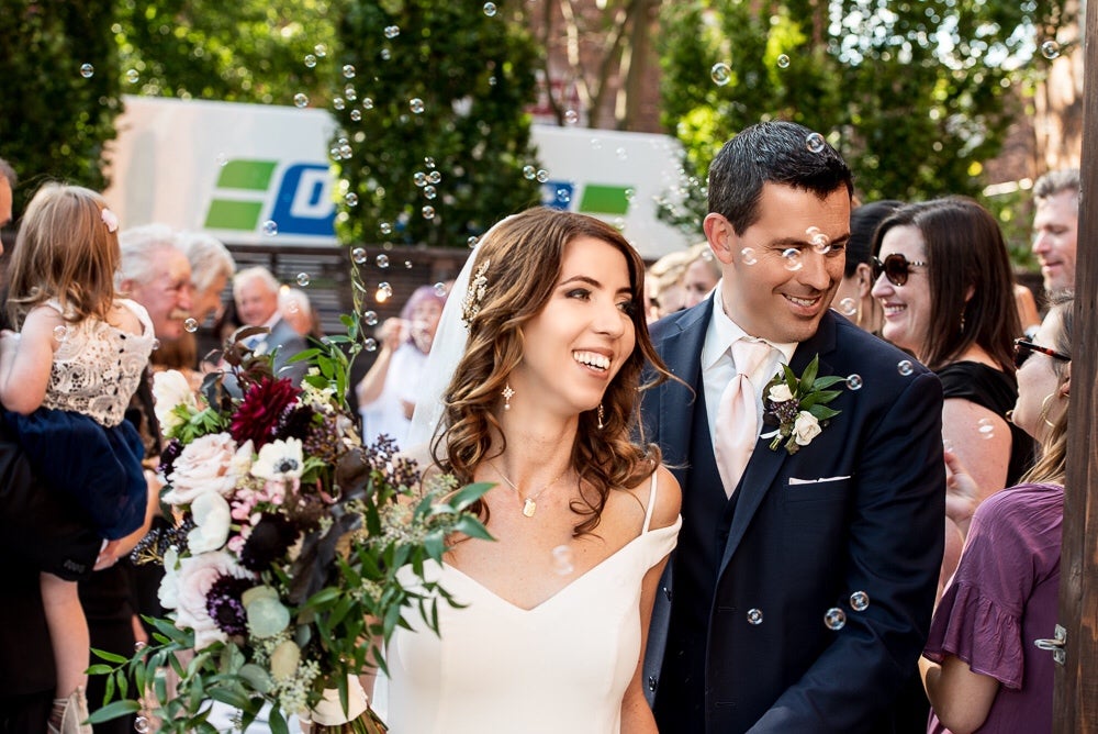 The style of our wedding was edgy-chic, as we wanted it to be unique from the other weddings we had been to. Our colors were deep and dramatic dark purple, navy blue, with very light blush pink accents. I walked down the aisle with my father to our harpist’s rendition of “Green Apples” by Chantal Kreviazuk. Our guests blew bubbles at us once we were pronounced man and wife – this was especially for our niece (and flower girl) who loves bubbles. We performed a choreographed dance for our guests to a popular Arkells song, “And Then Some,” made the lift, and got a standing ovation! Ryan works at the Scotiabank Arena, so we thought it would be fun and fitting to have a kiss cam to involve all our guests. Everyone danced and had a blast all night, and our wedding day could not have turned out more perfect for us!