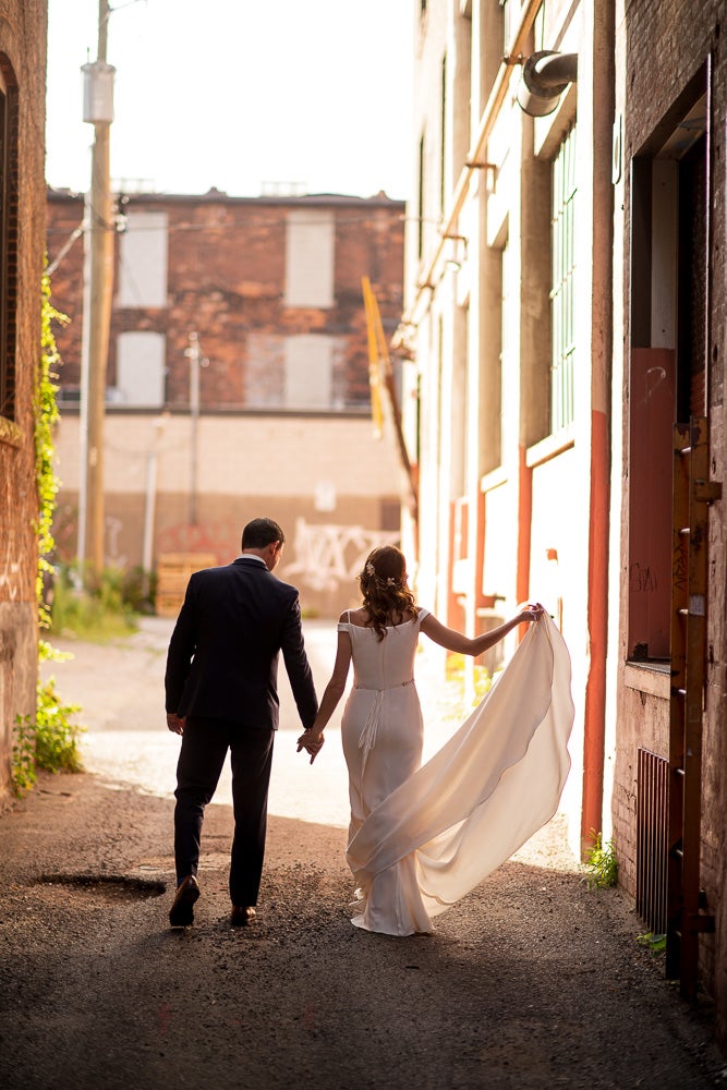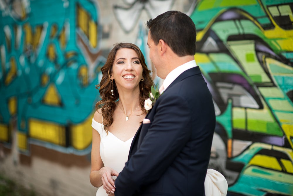 I said yes to the very first dress I tried on—Tara Keely, Style 2704. I had not been to any other bridal shops before Kleinfeld because I knew exactly what I wanted. I was inspired by the simple design of Meghan Markle’s wedding dress—it was clean and really drew the focus in on her. I felt my gown was similarly simple, and then the off-the-shoulder neckline with the added straps, the long train, and the ivory creamy luxurious fabric really represented my own style, so I felt it was the perfect dress for me. The Kleinfeld consultants cheered when I decided to get the dress and brought a glass of champagne for my sister (Matron of Honor) and I. The whole experience was exhilarating! The belt is also from Kleinfeld—I tried it on during one of my fittings and then could not imagine my dress without it.