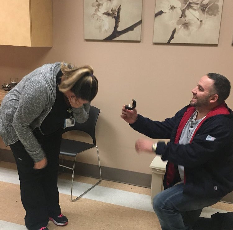 I was at work doing a double, when my boss came into my room (I am an ultrasound technician) and said she had to speak with me. I then saw Nick walk through the door and he said “Hey, I am surprising you for lunch.” I was very excited because Nick works nights so he was usually sleeping at this time. So I said sure—I was all excited! He then said to me “What’s over there, is that your machine?” I looked over and then looked back at him and he was on one knee and said “ I love you, will you marry me?” I was in complete shock and did not say anything. I kept staring at the ring and saying “Are you serious right now ??” After 5 minuets of this he said “Are you going to answer?” LOL and I said “Of course YES!!!” My coworker and boss watched it from the other room and got a lot of great pictures!