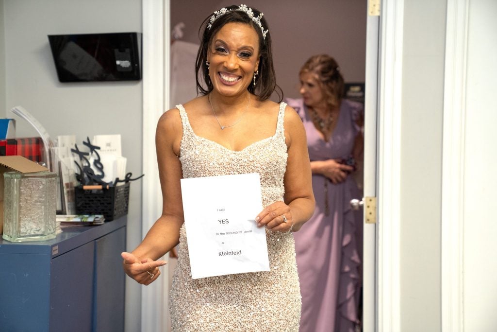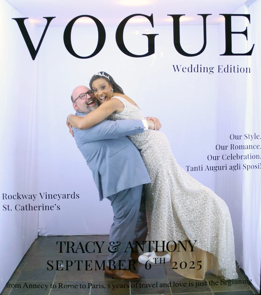 We had a Vogue photo booth for guests with a cover written in both Italian and English. I surprised Anthony by hiring a second florist to create a ceiling installation as well as surprised him with my second Kleinfeld dress which was introduced during our slide show!